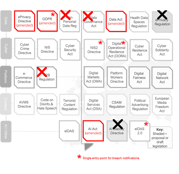 The Digital Omnibus amends and consolidates some of those instruments, and repeals others. The diagram below shows the effect of these changes in red.